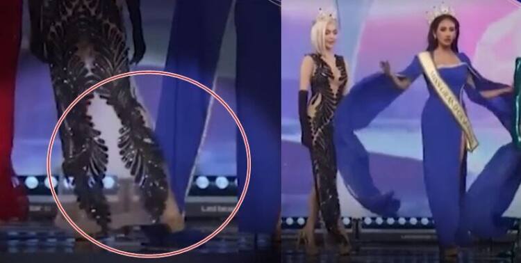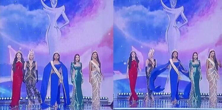 “พอมันมีภาพที่เราใช้เท้าเขี่ยกระโปรง ก็บอกว่าเราไม่ถูกกับน้องหรือเปล่า คือจริงๆ จะบอกว่าไม่ได้มีปัญหาอะไรกันนะคะ ก็คือถ้าให้อธิบายเหตุการณ์ที่เกิดขึ้น ถ้าหลายๆ คนได้เห็น ก็จะเห็นว่าฟ้าใส่วิก เราไม่ได้ล็อกมงฯ กับวิกด้วย แล้วมันเป็นการใส่แบบวาง โชว์ที่เดินมันคือฟินนาเล่ เราไม่ได้เดินคนเดียว มันมีคนที่เดินต่อเราติดๆ เลย ถ้าเห็นในคลิป เหมือนมันเป็นเหตุการณ์ที่เราก็ไม่รู้ ว่าเขาจะมีการสะบัดผ้า ถ้าดูในคลิปเราจะมีการฉุกคิดแป๊บเดียว ประมาณ 1-2 วิ ว่าเราจะเอายังไงต่อ ซึ่งถ้าเราก้มคือหนึ่งชุดเราไม่สะดวก เพราะชุดเราแหวกตรงช่วงอก สองคือเรื่องของมงฯ ถ้าเราก้มหรือขยับเยอะ มงฯ เราอาจจะร่วงได้”