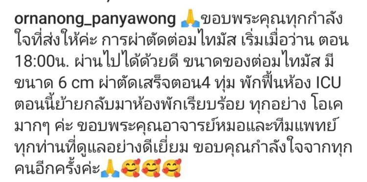 “ขอบพระคุณทุกกำลังใจที่ส่งให้ค่ะ การผ่าตัดต่อมไทมัส เริ่มเมื่อวาน ตอน 18:00 น. ผ่านไปได้ด้วยดี ขนาดของต่อมไทมัส มีขนาด 6 cm ผ่าตัดเสร็จตอน 4 ทุ่ม พักฟื้นห้อง ICU ตอนนี้ย้ายกลับมาห้องพักเรียบร้อย ทุกอย่าง โอเคมากๆ ค่ะ ขอบพระคุณอาจารย์หมอและทีมแพทย์ทุกท่านที่ดูแลอย่างดีเยี่ยม ขอบคุณกำลังใจจากทุกคนอีกครั้งค่ะ🙏🥰🥰🥰”