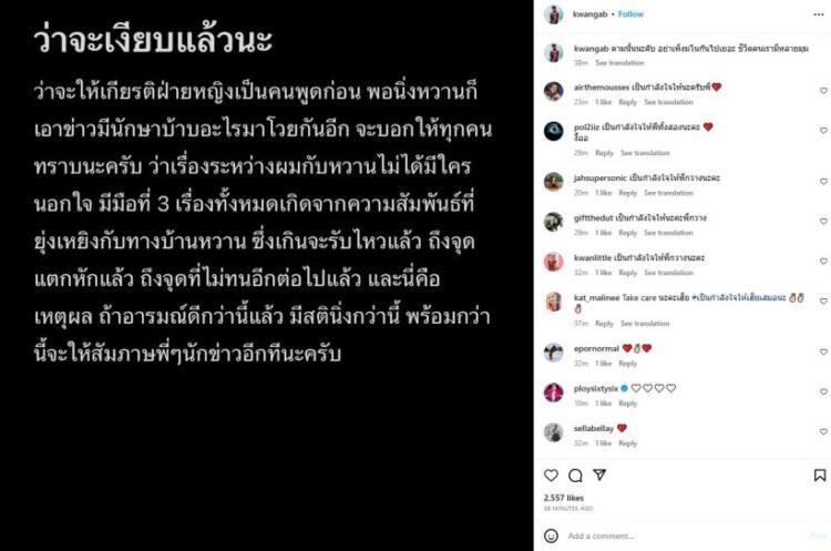 “ว่าจะเงียบแล้วนะ ว่าจะให้เกียรติฝ่ายหญิงเป็นคนพูดก่อน พอนิ่งหวานก็เอาข่าวมีนักศึกษาบ้าบออะไรมาโวยกันอีก จะบอกให้ทุกคนทราบนะครับ ว่าเรื่องระหว่างผมกับหวานไม่ได้มีใครนอกใจ มีมือที่ 3 เรื่องทั้งหมดเกิดจากความสัมพันธ์ที่ยุ่งเหยิงกับทางบ้านหวาน ซึ่งเกินจะรับไหวแล้ว ถึงจุดแตกหักแล้วถึงจุดที่ไม่ทนอีกต่อไปแล้ว