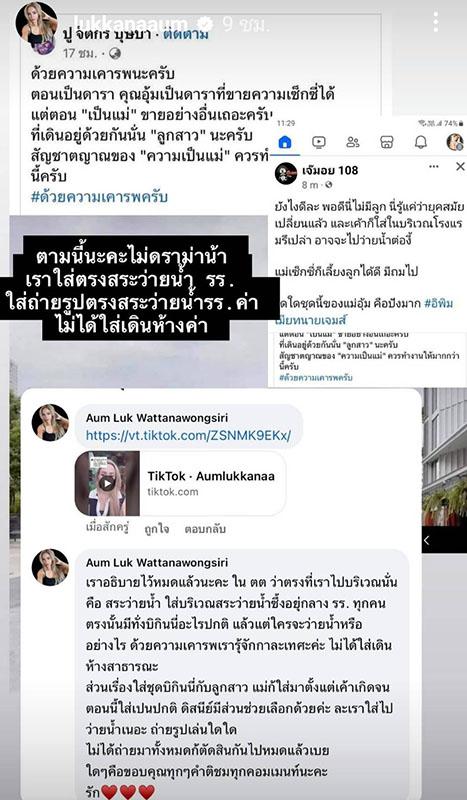 ขณะที่ปู จิตรกร ก็ได้แชร์คลิปดังกล่าวไปเผยแพร่ด้วยเช่นเดียวกัน ขณะที่สตอรี่อินสตาแกรม สาวอุ้มก็เผยย้ำว่า “ตามนี้นะคะ ไม่ดรามาน้า เราใส่ตรงสระว่ายน้ำโรงแรมใส่ถ่ายรูปตรงสระว่ายน้ำโรงแรมค่า ไม่ได้ใส่เดินห้างค่า