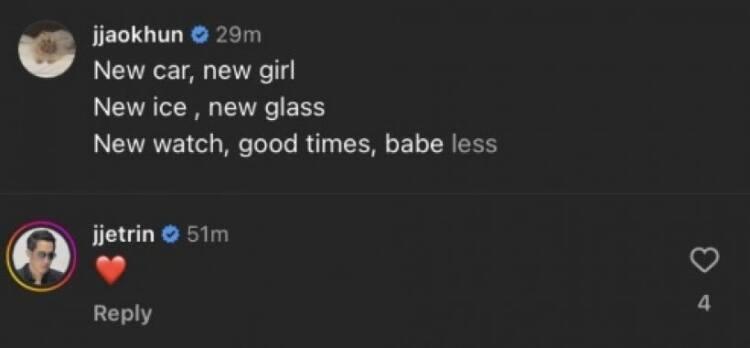 เพิ่งจะเคลียร์ว่าไม่มีอะไรกอไผ่กับ “เอินเอิน ฟาติมา” นางเอกเอ็มวีของตัวเองไปหมาดๆ ดูเหมือนว่าล่าสุด “เจ้าขุน จักรภัทร” ลูกชาย “เจ เจตริน – ปิ่น เก็จมณี” จะปล่อยข่าวใหม่ให้ตัวเองอีกแล้ว หลังจากที่ลงภาพและคลิปเซ็ตใหม่ พร้อมกับแคปชั่นว่า “New car, New girl, New ice, New glass, New watch, Good times, babe”