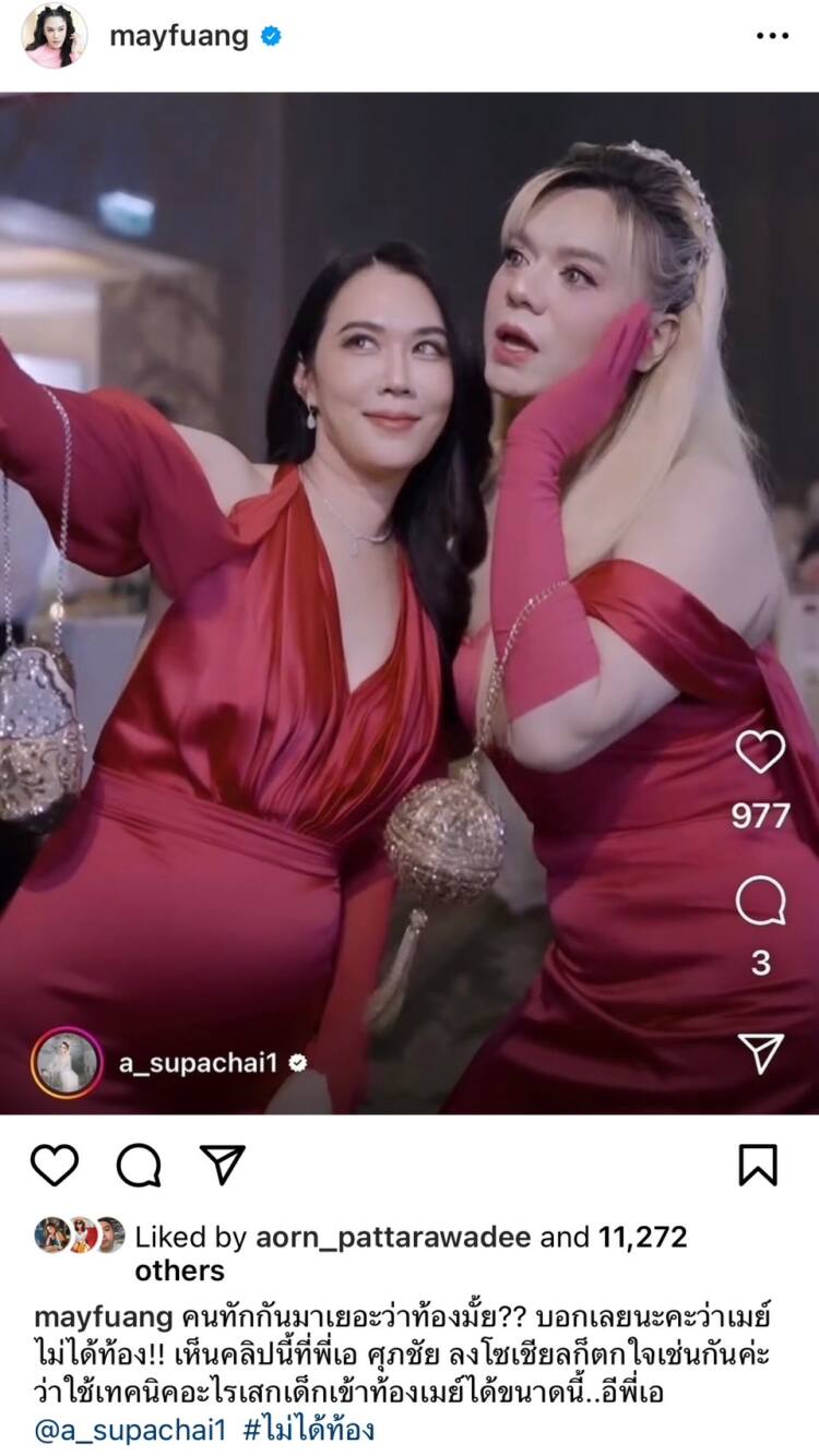 “คนทักกันมาเยอะว่าท้องมั้ย?? บอกเลยนะคะว่าเมย์ไม่ได้ท้อง!! เห็นคลิปนี้ที่พี่เอ ศุภชัย ลงโซเชียลก็ตกใจเช่นกันค่ะ ว่าใช้เทคนิคอะไร เสกเด็กเข้าท้องเมย์ได้ขนาดนี้…อีพี่เอ #ไม่ได้ท้อง”