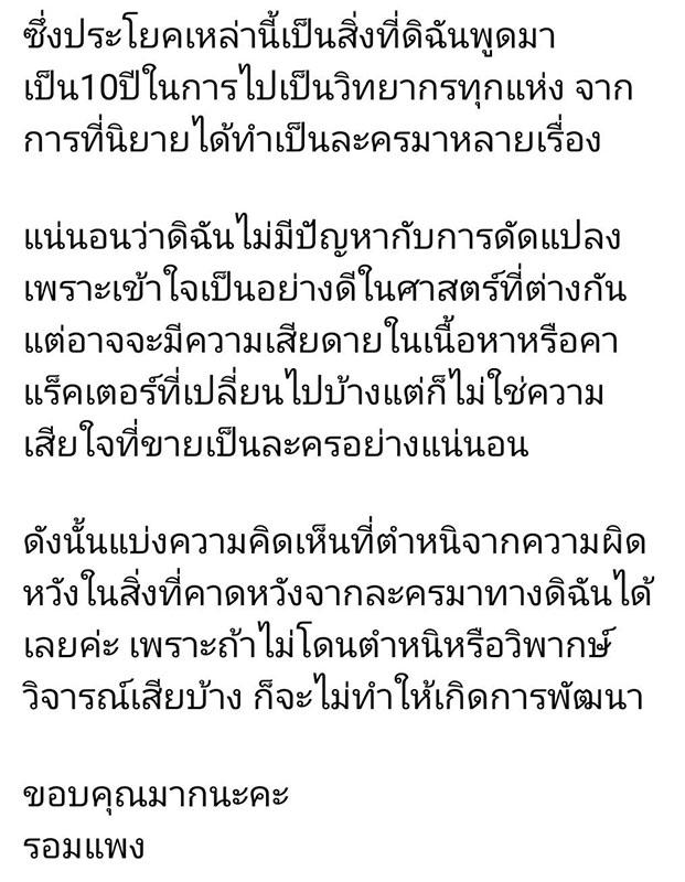 ดังนั้นแบ่งความคิดเห็นที่ตำหนิจากความผิดหวังในสิ่งที่คาดหวังจากละครมาทางดิฉันได้เลยค่ะ เพราะถ้าไม่โดนตำหนิหรือวิพากษ์วิจารณ์เสียบ้าง ก็จะไม่ทำให้เกิดการพัฒนาขอบคุณมากนะคะ รอมแพง”