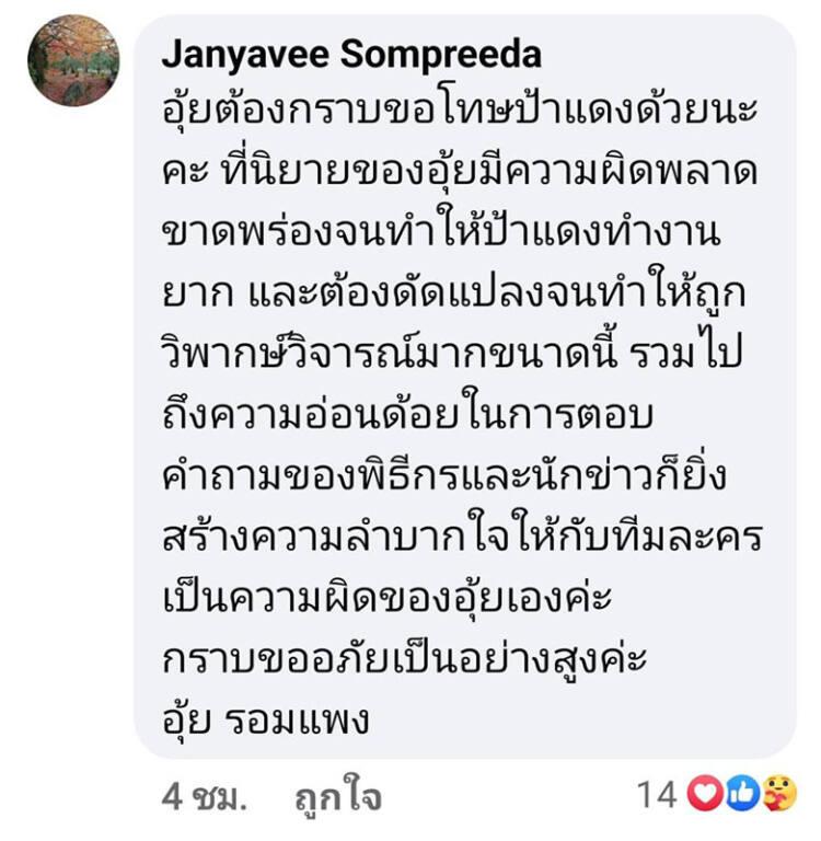 ต่อมารอมแพงก็ได้เข้าไปเมนต์ใต้โพสต์ของแดง ศัลยา ระบุว่า “อุ้ยต้องกราบขอโทษป้าแดงด้วยนะคะ ที่นิยายของอุ้ยมีความผิดพลาดขาดพร่องจนทำให้ป้าแดงทำงานยาก และต้องดัดแปลงจนทำให้ถูกวิพากษ์วิจารณ์มากขนาดนี้ รวมไปถึงความอ่อนด้อยในการตอบคำถามของพิธีกรและนักข่าวก็ยิ่งสร้างความลำบากใจให้กับทีมละคร เป็นความผิดของอุ้ยเองค่ะ กราบขออภัยเป็นอย่างสูงค่ะ อุ้ย รอมแพง”