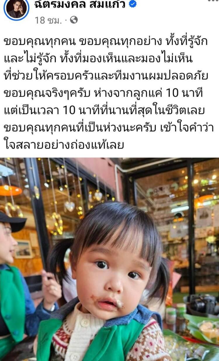 “ขอบคุณทุกคน ขอบคุณทุกอย่าง ทั้งที่รู้จักและไม่รู้จัก ทั้งที่มองเห็นและมองไม่เห็น ที่ช่วยให้ครอบครัวและทีมงานผมปลอดภัย ขอบคุณจริงๆ ครับ ห่างจากลูกแค่ 10 นาที แต่เป็นเวลา 10 นาทีที่นานที่สุดในชีวิตเลย ขอบคุณทุกคนที่เป็นห่วงนะครับ เข้าใจคำว่าใจสลายอย่างถ่องแท้เลย”