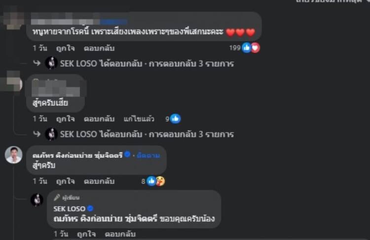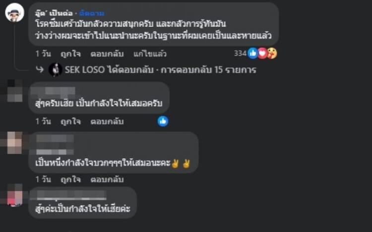 เคยเป็นโรคไบโพลาร์ ซึ่งมักพ่วงมากับโรคซึมเศร้า ล่าสุดเฟซบุ๊ก “เสก โลโซ” ก็ได้โพสต์ความระบุว่า ตอนนี้ก็ยังไม่หายขาดจากการเป็นโรคซึมเศร้า แต่ต้องเอาชนะมันให้ได้ “ฉันกำลังต่อสู้กับโรคซึมเศร้า!! ฉันต้องชนะมันให้ได้!!!” ท่ามกลางกำลังใจจากชาวเน็ต รวมไปถึงคนบันเทิง ที่เข้าไปเมนต์ให้กำลังใจ โดยเฉพาะ “อู๊ด เป็นต่อ” ที่เมนต์ว่า “โรคซึมเศร้ามันกลัวความสนุกครับ และกลัวการรู้ทันมัน ว่างว่างผมจะเข้าไปแนะนำนะครับในฐานะที่ผมเคยเป็นและหายแล้ว”