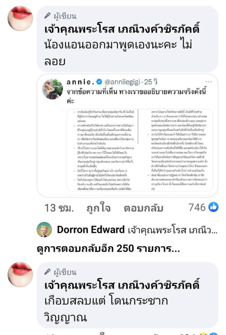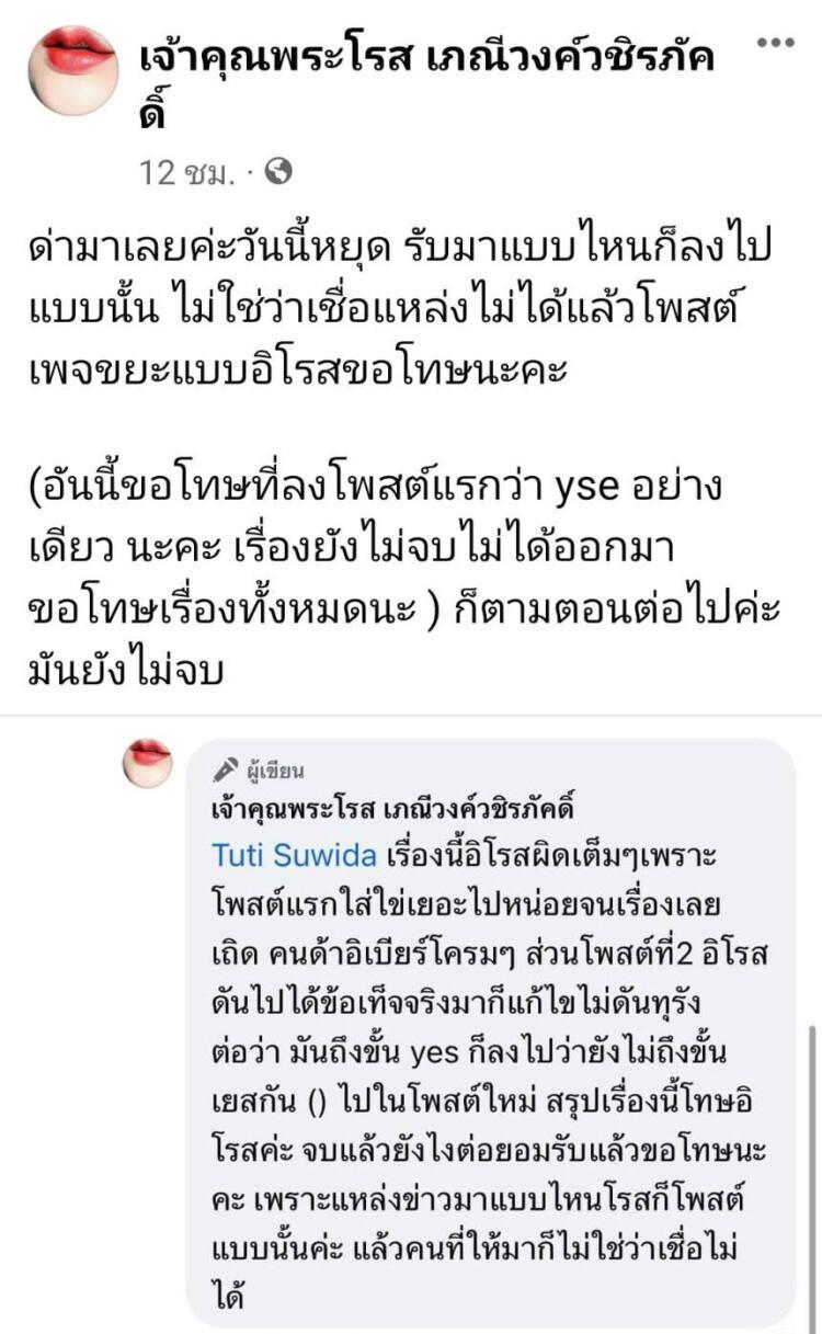 ล่าสุดเพจดังกล่าวได้โพสต์ข้อความว่า “ด่ามาเลยค่ะวันนี้หยุด รับมาแบบไหนก็ลงไปแบบนั้น ไม่ใช่ว่าเชื่อแหล่งไม่ได้แล้วโพสต์ เพจขยะแบบอิโรสขอโทษนะคะ (อันนี้ขอโทษที่ลงโพสต์แรกว่า … อย่างเดียว นะคะ เรื่องยังไม่จบไม่ได้ออกมาขอโทษเรื่องทั้งหมดนะ ) ก็ตามตอนต่อไปค่ะมันยังไม่จบ”