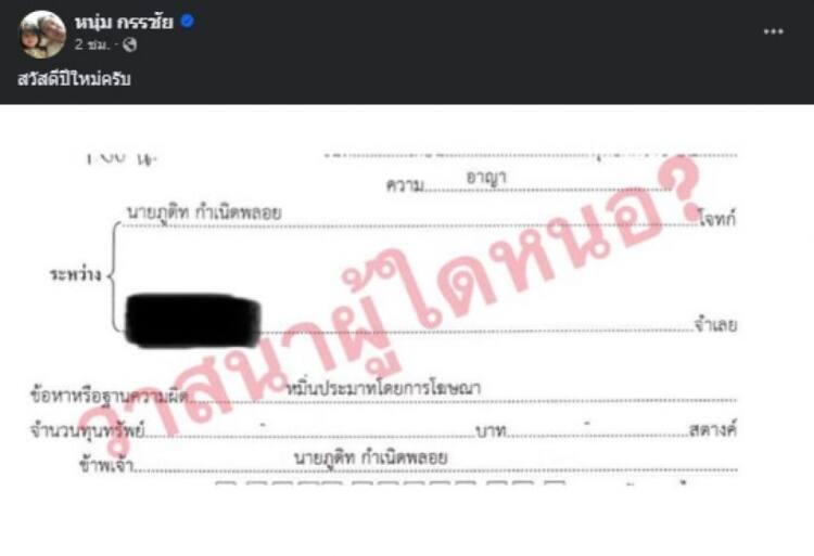 ฮือฮาส่งท้ายปีอีกคน สำหรับ “หนุ่ม กรรชัย กำเนิดพลอย” หลังจากที่วันนี้ (31 ธ.ค.66) โพสต์ภาพหมายศาลฟ้องใครบางคนในเฟซบุ๊กส่วนตัว โดยฟ้องในข้อหาหมิ่นประมาท แต่ปิดชื่อผู้ที่ถูกฟ้องเอาไว้ พร้อมข้อความระบุว่า “สวัสดีปีใหม่ครับ” รวมทั้งมีข้อความคาดทับหมายศาล ระบุว่า “วาสนาผู้ใดหนอ?” งานนี้จะจัดการใคร ต้องจับตาดูกันอีกที