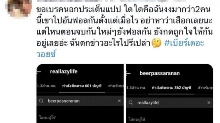 ล่าสุดก็มีชาวเน็ตรายหนึ่งเข้ามาถามข้อความชวนสงสัยนอกประเด็นดังกล่าว แต่เป็นเรื่องราวระหว่างเบียร์กับแฟนเก่าอย่าง “ท็อป Lazyloxy” ซึ่งที่ผ่านมาทั้งคู่จบดี และไม่มีการอันฟอลโลว์ใดๆ กัน แต่หลังเป็นข่าวดัง ปรากฏว่ามีชาวเน็ตตาดี เห็นทั้งคู่ต่างอันฟอลโลว์ไอจีกันไปเรียบร้อยแล้ว