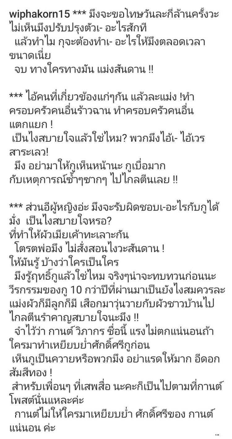 จำไว้ว่า กานต์ วิภากร ชื่อนี้ แรงไม่ตกแน่นอนถ้าใครมาทำเหยียบย่ำศักดิ์ศรีกูก่อน เห็นกูเป็นควายหรือพวกมึง อย่าแรดให้มาก อีดอกส้มสีทอง ! สำหรับเพื่อนๆ ที่เสพสื่อ นะคะก็เป็นไปตามที่กานต์โพสต์นั่นแหละค่ะ กานต์ไม่ให้ใครมาเหยียบย่ำ ศักดิ์ศรีของ กานต์ แน่นอน ค่ะ แต่ขอร้อง! อย่ามาด่า กานต์ เลยค่ะเพราะกานต์ ไม่ได้เป็นคนเริ่ม ขอบคุณค่ะ!!”