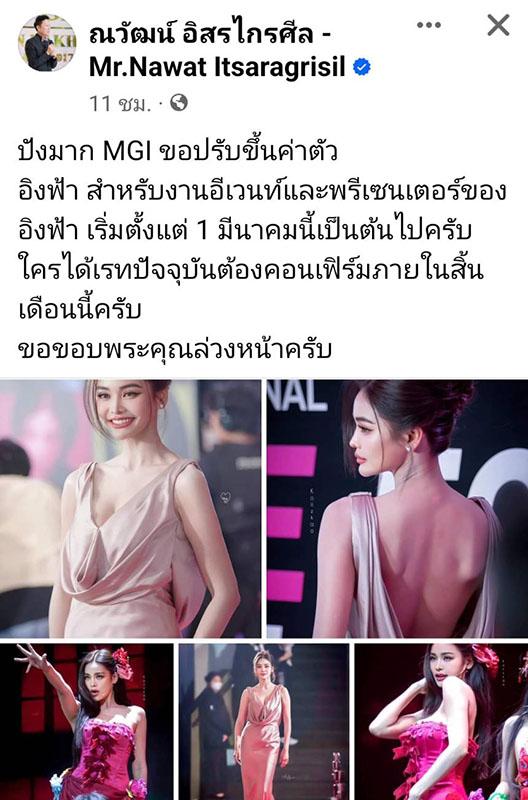 “ปังมาก MGI ขอปรับขึ้นค่าตัวอิงฟ้า สำหรับงานอีเวนต์และพรีเซ็นเตอร์ เริ่มตั้งแต่ 1 มีนาคมนี้เป็นต้นไปครับใครได้เรตปัจจุบัน ต้องคอนเฟิร์มภายในสิ้นเดือนนี้ครับ ขอขอบพระคุณล่วงหน้าครับ”