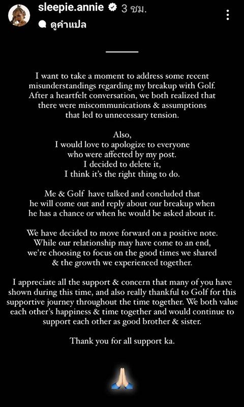 นอกจากนี้ ฉันอยากจะขอโทษทุกคนที่ได้รับผลกระทบจากโพสต์ของฉัน ฉันตัดสินใจลบมันออกไป ฉันคิดว่ามันเป็นสิ่งที่ควรทำเพราะฉันกับกอล์ฟเราคุยกันแล้วสรุปกันแล้วว่าเขาจะออกมาตอบเรื่องการเลิกราของเราตอนที่มีโอกาสหรือเมื่อไหร่ที่เขาถูกถามเรื่องนี้