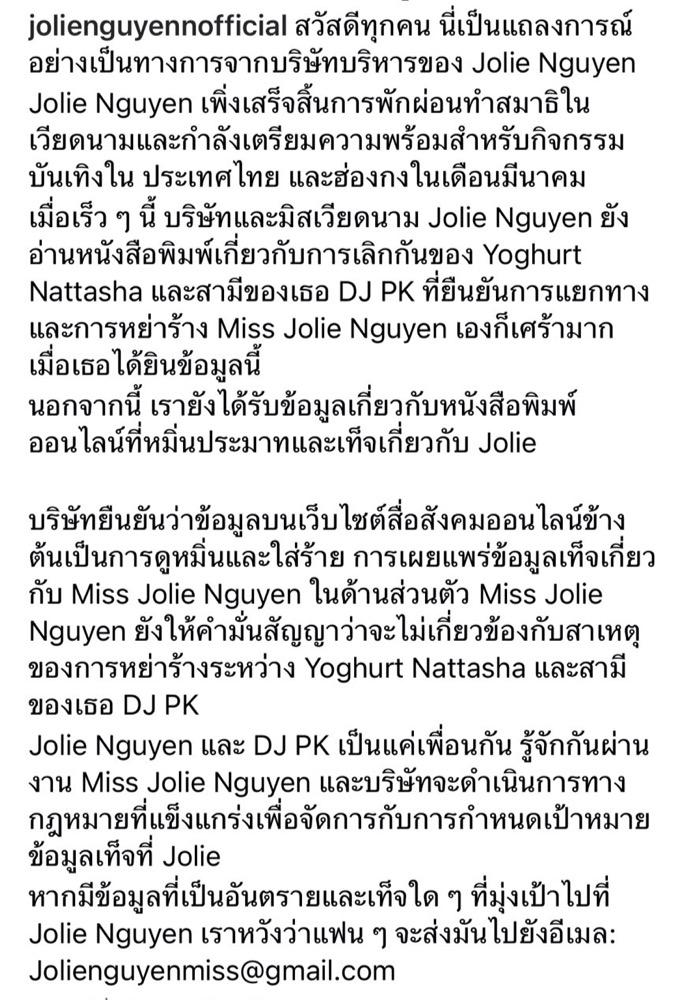 บริษัทยืนยันว่าข้อมูลบนเว็บไซต์โซเชียลมีเดียข้างต้นเป็นการดูถูกและใส่ร้าย เผยแพร่ข้อมูลเท็จเกี่ยวกับ Miss Jolie Nguyen ในด้านส่วนตัว Miss Jolie Nguyen ยังให้คํามั่นว่าจะไม่มีส่วนเกี่ยวข้องกับสาเหตุของการหย่าร้างระหว่าง Yoghurt Nattasha และ DJ PK สามีของเธอ
