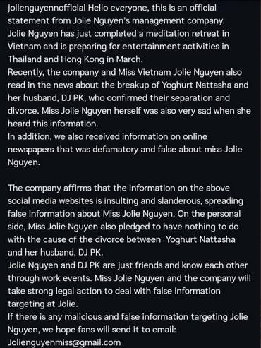 “สวัสดีทุกคน นี่คือแถลงการณ์อย่างเป็นทางการจากบริษัทจัดการของ Jolie Nguyen