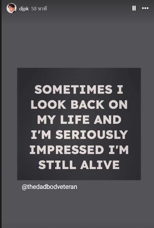“SOMETIMES I LOOK BACK ON MY LIFE AND I’M SERIOUSLY IMPRESSED I’M STILL ALIVE. แปลวา “บางครั้งเมื่อมองกลับไป ฉันก็รู้สึกประทับใจมากที่ฉันยังคงมีชีวิตอยู่ได้”