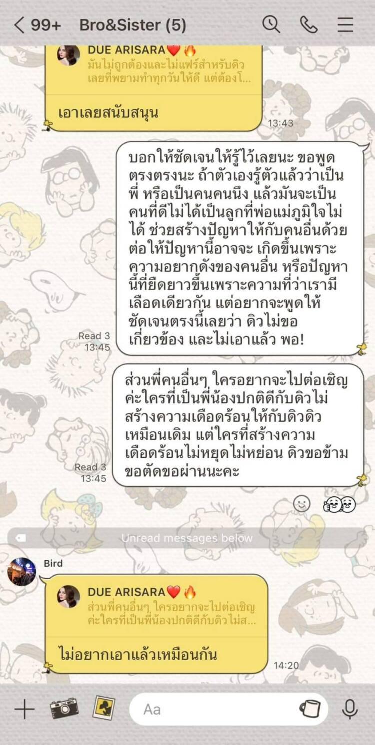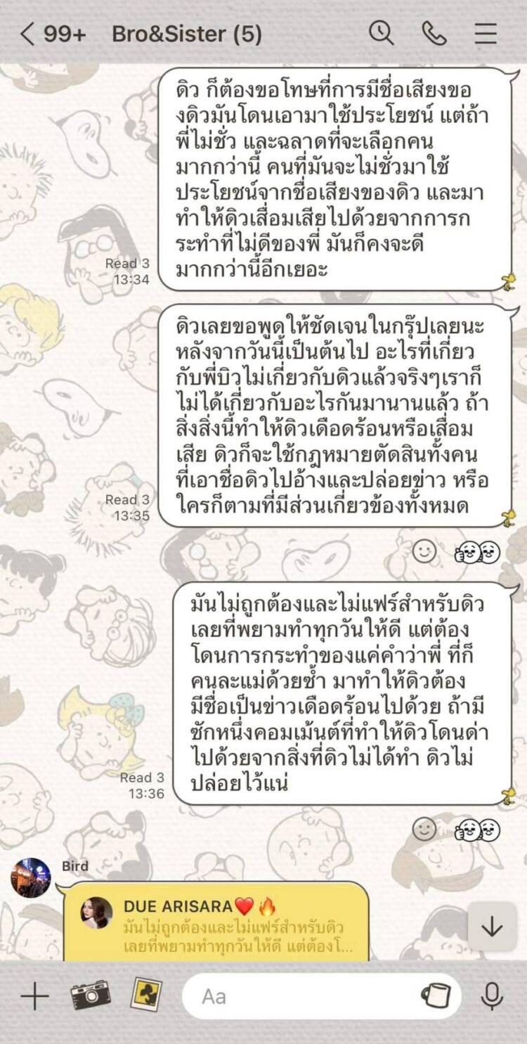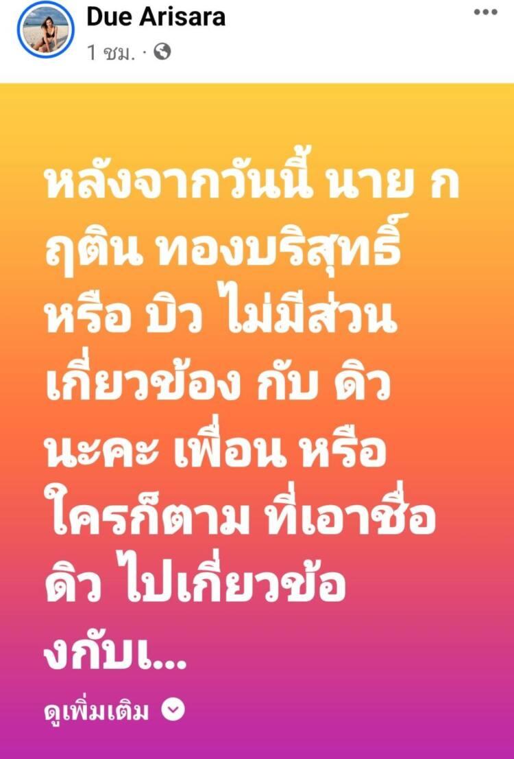 “หลังจากวันนี้ นาย กฤติน ทองบริสุทธิ์ หรือ บิว ไม่มีส่วนเกี่ยวข้องกับ ดิว นะคะ เพื่อนๆ หรือใครก็ตาม ที่เอาชื่อดิว ไปเกี่ยวข้องกับเขา แอบอ้าง ใช้ประโยชน์ หรือทำให้มีผลกระทบในทางลบ ถ้ายังไม่ลบทิ้งแก้ไข เปลี่ยนแปลง หรือยังทำอยู่ ดิวขอให้ทีมทนายของดิวจัดการนะคะ”