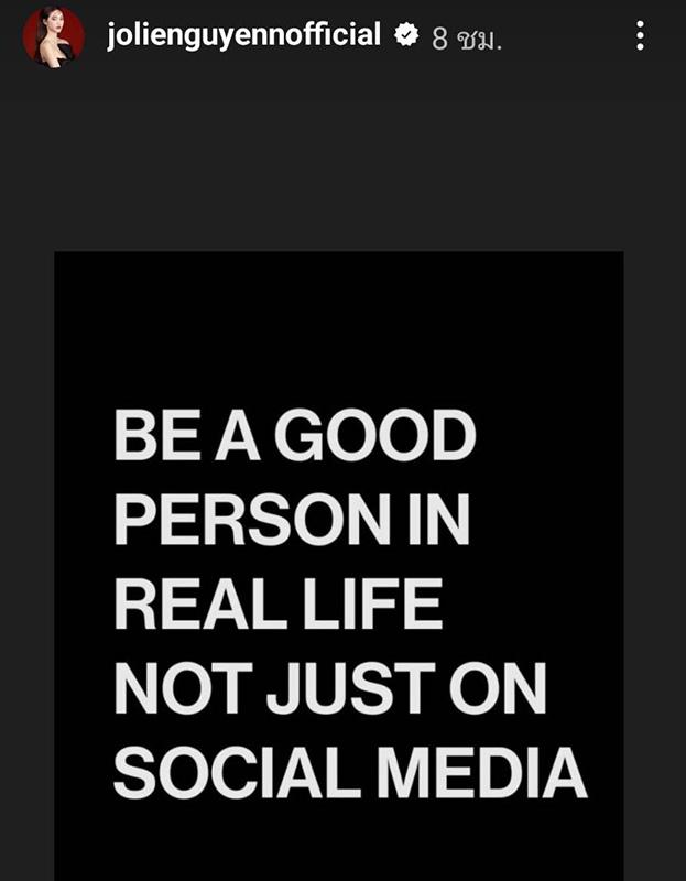 ล่าสุดสตอรี่ไอจี โจลี่ เหงียน ก็เผยคำคม หลังดรามาดังกล่าว ระบุว่า be a good person in real life not just on social media แปลว่า เป็นคนดีในชีวิตจริงไม่ใช่แค่ในโซเชียลมีเดีย แสบๆ แซ่บๆ ส่วนหมายถึงใคร อันนี้ยากจะคาดเดาได้