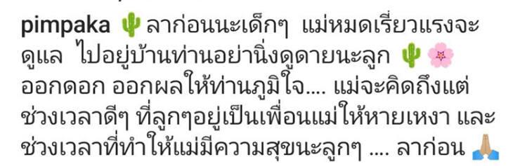 “ลาก่อนนะเด็กๆ แม่หมดเรี่ยวแรวจะดูแล ไปอยู่บ้านท่านอย่านิ่งดูดายนะลูก ออกดอก ออกผลให้ท่านภูมิใจ แม่จะคิดถึงแต่ช่วงเวลาดีๆ ที่ลูกๆ อยู่เป็นเพื่อนแม่ให้หายเหงา และช่วงเวลาที่ทำให้แม่มีความสุขนะลูกๆ …ลาก่อน” ท่ามกลางกำลังใจจากแฟนๆ เจ้าตัว