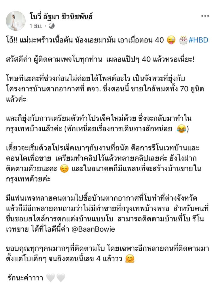 “โอ้!! แม่มะพร้าวเนื้อตัน น้องเอยมามัน เอาเมื่อตอน 40 😜 🎂#HBD สวัสดีค่า ผู้ติดตามเพจโบทุกท่าน เผลอแป๊ป ๆ 40 แล้วหรอเนี่ยะ! โทษทีนะคะที่ช่วงก่อนไม่ค่อยได้โพสต์อะไร เป็นจังหวะที่ยุ่งกับโครงการบ้านตากอากาศที่ ตจว. ซึ่งตอนนี้ ขายใกล้หมดทั้ง 70 ยูนิตแล้วค่ะ และก็ยุ่งกับการเตรียมตัวทำโปรเจ็กต์ใหม่ด้วย ซึ่งจะกลับมาทำในกรุงเทพบ้างแล้วค่ะ (พักเหนื่อยเรื่องการเดินทางสักหน่อย 😂) เดี๋ยวจะเริ่มด้วยโปรเจกต์เบา ๆ กับงานที่ถนัด คือการรีโนเวทบ้านและคอนโดเพื่อขาย เตรียมทำคลิปไว้แล้วหลายคลิปเลยค่ะ ยังไงฝากติดตามด้วยนะคะ ☺️ และในอนาคตก็มีแพลนที่จะสร้างบ้านขายในกรุงเทพด้วยค่ะ