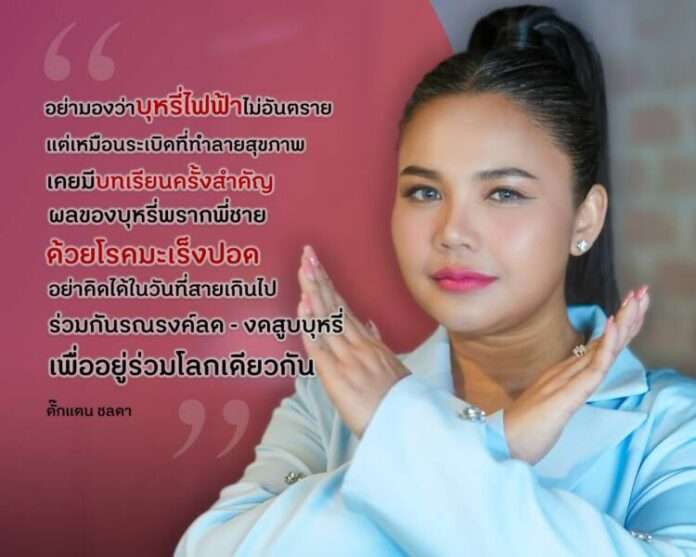 มีประสบการณ์ตรงที่จำฝังใจจนทำให้นักร้องลูกทุ่งอย่าง ‘ตั๊กแตน ชลดา’ ลั่น! ไม่ควรยุ่งเกี่ยวกับบุหรี่ทุกชนิด ไม่ใช่แค่สุขภาพของคนสูบเท่านั้นที่ค่อย ๆ ถูกทำลายโดยตรง แต่คนรอบข้างที่ต้องสูดควันบุหรี่มือสองก็ได้รับผลกระทบด้วยเช่นกัน โดยตั๊กแตนขอแชร์เรื่องจริงที่ได้สัมผัสจากการสูบบุหรี่ไฟฟ้าหน้าเวทีที่คนสูบไม่คิด ส่วนคนที่ได้รับก็ต้องหาวิธีหลีกเลี่ยงเอาตัวรอดให้ได้