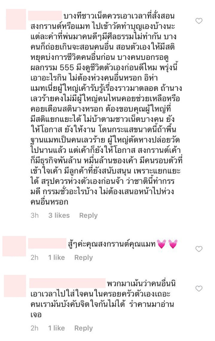 อย่างไรก็ตาม มีแฟนคลับพยายามเข้าไปเตือนสติให้งดคอมเมนต์ที่ไม่ดีบ้าง และให้เห็นแก่พระพุทธรูปที่อยู่เบื้องหลัง ต่อหน้าพระก็ไม่เว้นเลยเหรอ !? อีกทั้งภาพและแคปชั่นดังกล่าวก็ไม่ได้มีอะไรเกี่ยวกับสาวแมทเลย แต่ก็ยังถูกโจมตีจนได้