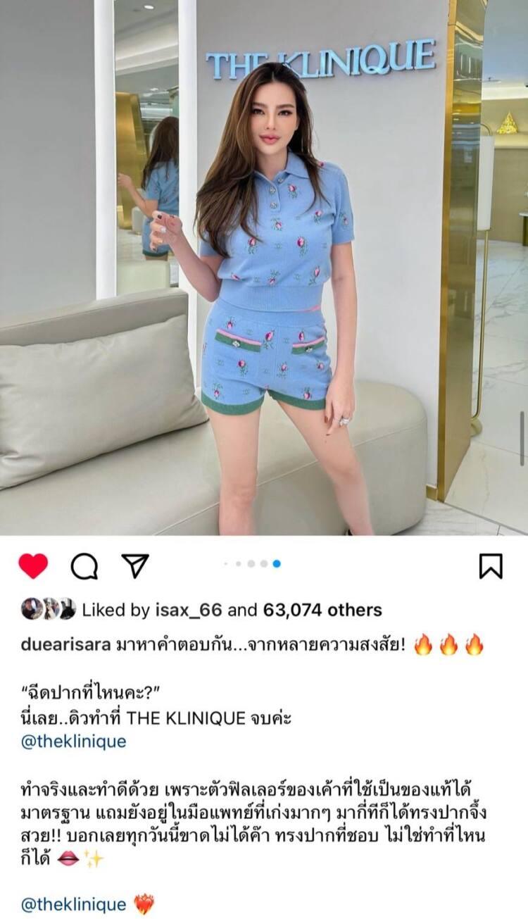 “หน้าดิวไม่เคยทำศัลยกรรม แต่จะเป็นสายเข็ม ไม่ว่าจะเป็นโบท็อกซ์ ฟิลเลอร์ เรียกว่าเป็นเพื่อนรัก และตั้งแต่ฉีดปากงานเข้ามาเยอะมาก มาจากทุกทิศทุกทาง ดีมากเลยค่ะสิ่งที่ทุกคนจะถามดิวบ่อยๆ ก็คือฉีดปากที่ไหน อยากได้ปากแบบดิว เพราะมีคลินิกหลายที่เอารูปดิวไปใช้ บอกว่าดิวฉีดที่นั่นที่นี่บอกตรงนี้เลยนะคะ ทุกคนจะได้ไม่ต้องไปลองผิดลองถูก ดิวจบที่ THE KLINIQUE ทรงปากสวยดูเป็นธรรมชาติ เราค่อนข้างมีมาตรฐานที่ค่อนข้างสูงนิดนึง ดังนั้นไม่ว่าอะไรก็ตามที่เราเลือกให้กับตัวเอง มันต้องดีที่สุด เทคนิกการฉีดของคุณหมอก็สำคัญมาก ไม่อยากพลาด เราก็เลยเลือกที่นี่ดีกว่า เพราะมันจบในที่เดียวจริงๆ มาเจอที่นี่แล้วไม่ไปฉีดที่ไหนอีกเลย ที่เดียวที่ดิวรักที่สุด ”