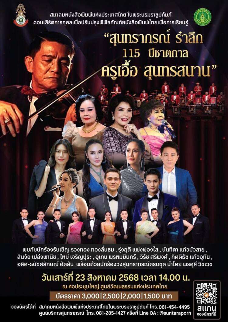 นายนคร วีระประวัติ นายกสมาคมหนังสือพิมพ์แห่งประเทศไทย ในพระบรมราชูปถัมภ์ เปิดเผยว่า สมาคมฯ ได้จัดคอนเสิร์ตการกุศล “สุนทราภรณ์ รำลึก 115 ปี ชาตกาล ครูเอื้อ สุนทรสนาน” ในวันเสาร์ที่ 23 สิงหาคม 2568 เวลา 14.00 น. ณ หอประชุมใหญ่ ศูนย์วัฒนธรรมแห่งประเทศไทย เพื่อรำลึกถึง “ครูเอื้อ สุนทรสนาน” ผู้ก่อตั้งวงดนตรี “สุนทราภรณ์” และสร้างสรรค์บทเพลงอมตะอันทรงคุณค่าจากรุ่นสู่รุ่นมาถึงปัจจุบัน โดยนำรายได้ปรับปรุงพิพิธภัณฑ์หนังสือพิมพ์ไทย เพื่อการเรียนรู้ ณ หอประชุมใหญ่ ศูนย์วัฒนธรรมแห่งประเทศไทย