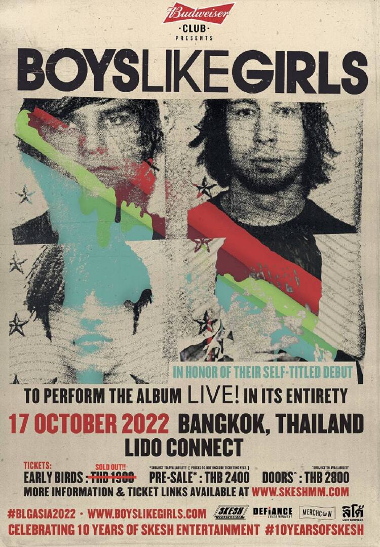 งานนี้แฟนๆ Boys Likes Girls ห้ามพลาด กับการมาร่วมปลุกตำนานและความทรงจำสมัยวัยรุ่นไปด้วยกัน เพราะครั้งนี้อาจเป็นโอกาสแรกและโอกาสเดียวที่จะได้สัมผัสกับวงป๊อบพังค์ระดับตำนานอย่าง Boys Like Girls ในประเทศไทย โดย งาน Budweiser Club Presents Boys Like Girls Live In Bangkok (บัดไวเซอร์ พรีเซ็นต์ บอยส์ ไลค์ เกิร์ลส์ ไลฟ์ อิน แบ็งค็อก) ในครั้งนี้ จะเกิดขึ้นใน วันที่ 17 ตุลาคม 2565 ณ ลิโด้ คอนเน็ค จำหน่ายบัตรแล้ววันนี้ที่ Ticketmelon