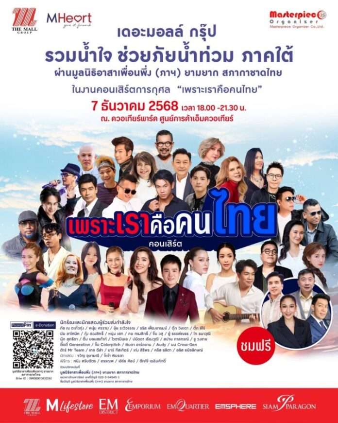 เดอะมอลล์ กรุ๊ป ร่วมกับมูลนิธิอาสาเพื่อนพึ่ง (ภาฯ) ยามยาก สภากาชาดไทย ขอเชิญชวนร่วมงานคอนเสิร์ตการกุศล “เพราะเราคือคนไทย” รวมน้ำใจ ช่วยภัยน้ำท่วม ภาคใต้ ภายใต้โครงการ “น้ำท่วมของกลุ่มเดอะมอลล์” ด้วยทัพศิลปิน, ดารา, นักร้อง นักแสดงชั้นนำของเมืองไทย ที่จะมาร่วมส่งกำลังใจและมอบความบันเทิงแบบจัดเต็ม ในวันอาทิตย์ ที่ 7 ธันวาคม 2568 เวลา 18.00 – 21.30 น. ณ ควอเทียร์พาร์ค ศูนย์การค้าเอ็มควอเทียร์ ชมฟรี! ไม่มีค่าใช้จ่าย