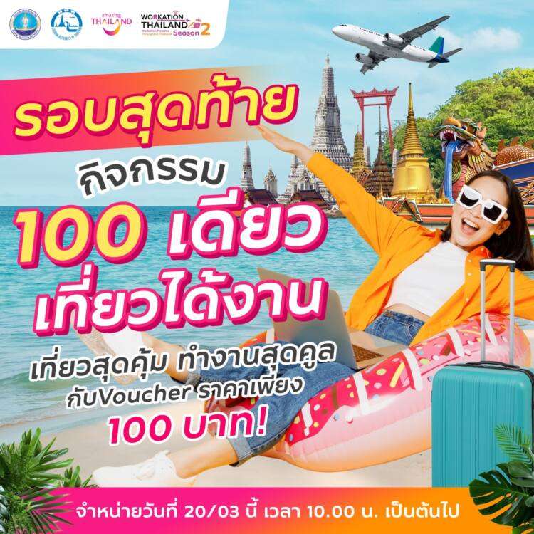 การท่องเที่ยวแห่งประเทศไทย (ททท.) จัดหนักจัดเต็มครั้งสุดท้ายกับแคมเปญกระตุ้นการท่องเที่ยวในรูปแบบ Workation ที่ส่งเสริมการออกเดินทางท่องเที่ยวพร้อมทำงาน เพื่อสร้างประสบการณ์การทำงานในรูปแบบใหม่และก่อเกิดการเดินทางท่องเที่ยวในช่วงฤดูท่องเที่ยว (High Season) ผ่านกิจกรรมส่งเสริมการขาย “100 เดียวเที่ยวได้งาน” ซึ่งเป็นกิจกรรมที่ส่งเสริมการตลาดและกระตุ้นการใช้จ่ายของนักท่องเที่ยว เพื่อก่อเกิดการเดินทางท่องเที่ยวภายในประเทศช่วงวันธรรมดา โดยนำเสนอสินค้าและการบริการด้านการท่องเที่ยวในรูปแบบบัตรกำนัล (Voucher) ซึ่งจะเสนอขายในราคาเพียง 100 บาทเท่านั้น