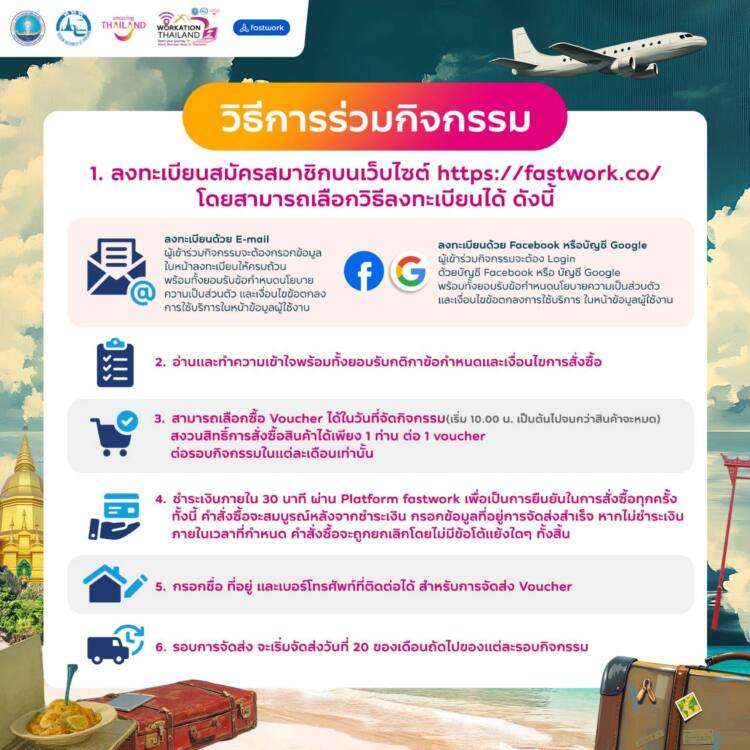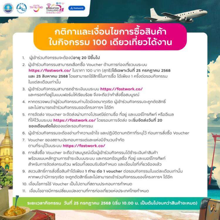 สำหรับกิจกรรม “100 เดียวเที่ยวได้งาน” ถือเป็นกลไกการตลาดสำคัญ ที่เชื่อมโยงแนวคิด Workation เข้ากับไลฟ์สไตล์ของคนทำงานรุ่นใหม่ที่ต้องการความยืดหยุ่นและสมดุลระหว่างชีวิตกับการทำงาน ผ่านการเลือกโลเคชั่นใหม่ ๆ ที่ช่วยเติมเต็มทั้งพลังใจและแรงบันดาลใจ โดยจะเปิดให้ให้นักท่องเที่ยวเข้าร่วมกิจกรรม ได้ทั้งหมด 2 รอบ ในวันที่ 25 กรกฎาคม 2568 และ วันที่ 25 สิงหาคม 2568 ผ่านทางเว็บไซต์ www.fastwork.co โดยเสนอสินค้าจากหลากหลายผู้ประกอบการ อาทิเช่น โรงแรมศรีพันวา ภูเก็ต, ไฮแอท รีเจนซี่ หัวหิน, เดอะซายน์ พัทยา, ดุสิตธานี ลากูนา, วานา นาวา วอเตอร์ จังเกิ้ล และ โอเอซิสสปา เป็นต้น ทั้งนี้ยังมี บัตรกำนัล (Voucher) สินค้าและบริการด้านการท่องเที่ยวจากสถานประกอบการชั้นนำที่เข้าร่วมกิจกรรมอีกมากมายให้นักท่องเที่ยวได้เลือก