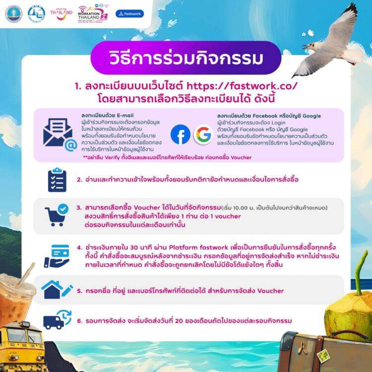 สำหรับนักท่องเที่ยวที่สนใจเข้าร่วมกิจกรรมสามารถสมัครสมาชิก Fastwork และดูรายละเอียดกติการได้ที่เว็บไซต์ www.fastwork.co และจะต้อง verify ทั้งอีเมลและเบอร์โทรศัพท์ให้เรียบร้อยก่อนกดซื้อสินค้า นอกจากนี้ภายใต้โครงการยังเสนอสิทธิพิเศษส่วนลด สูงสุดกว่า 80% จากสถานประกอบการชั้นนำทั่วไทย สามารถดูรายละเอียดได้ที่เว็บไซต์ www.tourismthailand.org/workationthailand หรือสอบถามข้อมูลเพิ่มเติมได้ที่ Line Official Account: @workationthailand