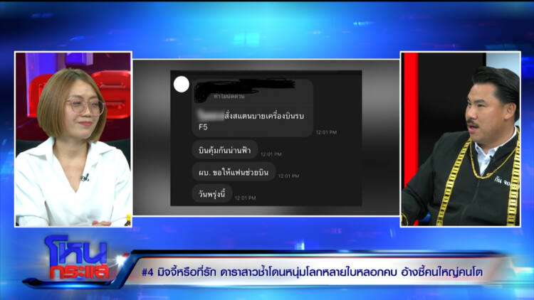 คะน้า : บอกอย่าเอาเรื่องเขา เขาเป็นคนมีปม อย่าจองล้างจองผลาญกันเลย ทางฮอตบอกว่าภรรยาของทหารอากาศท่านนี้เป็นญาติกับเขา แล้วคนนี้เหมือนฟีลพี่เขย แต่ตอนเขาโทรมาหาหนู เขาบอกว่าเขาเพิ่งรู้จักกัน เขาไม่ได้เป็นญาติพี่น้องอะไรกัน แต่หนูแอบไปค้นเฟซบุ๊ก มีรูปเขาตั้งแต่หลายปีก่อน อย่างที่คุณเกรซบอก คุณเกรซมีรูปและได้เจอว่าหลายปีมากแล้วที่เขารู้จักกัน