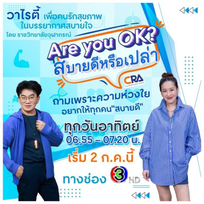 สำหรับผู้ที่รักสุขภาพมาอัพเดทเรื่องราวดี ๆ รู้ทันโรค และการดูแลตัวเองให้มีสุขภาพที่แข็งแรงในทุกเช้าวันอาทิตย์ตื่นมายิ้มรับสุขภาพดี อย่างมีความหวัง ทำความเข้าใจกับทุกเรื่องของสุขภาพได้ใน รายการ Are you OK? สบายดีหรือเปล่า ห้ามพลาดชมเทปแรก!! ในวันอาทิตย์ที่ 2 กรกฎาคม 2566 เวลา 06.55 – 07.20 น. ทางช่อง 3 กด 33 และแบ่งปันความสุขผ่าน #AreYouOkayสบายดีหรือเปล่าxCRA กันนะคะ…