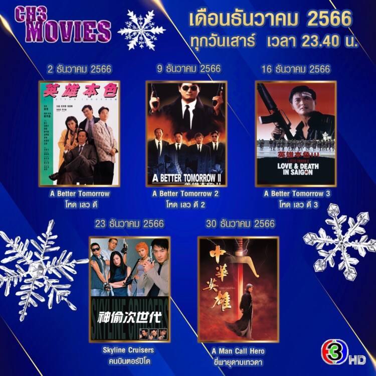 เวลา 23.40 น. เริ่มกันที่วันเสาร์ที่ 2 ธันวาคม 2566 ภาพยนตร์เรื่อง โหด เลว ดี (A Better Tomorrow) ต่อด้วย วันเสาร์ที่ 9 ธันวาคม 2566 ภาพยนตร์เรื่อง โหด เลว ดี 2 (A Better Tomorrow 2) และ วันเสาร์ที่ 16 ธันวาคม 2566 ภาพยนตร์เรื่อง โหด เลว ดี 3 (A Better Tomorrow 3) และวันเสาร์ที่ 23 ธันวาคม 2566 ภาพยนตร์เรื่อง คนบินตอร์ปิโด (Skyline Cruisers) ปิดท้ายด้วย วันเสาร์ที่ 30 ธันวาคม 2566 ภาพยนตร์เรื่อง ขี่พายุดาบเทวดา (A Man Call Hero)